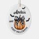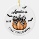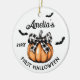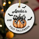 Baby's First Halloween Pumpkin Bow Bats Ceramic Ornament. A custom baby's name in a trendy script, orange pumpkins with cute bow and black bats. Personalize the ornament with your baby's name and year. A lovely Halloween holiday keepsake.