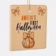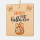 Baby's First Halloween Pumpkin Bow Ceramic Ornament. A custom baby's name in a trendy script, orange pumpkin with cute bow and orange bow. Personalize the ornament with your baby's name. A lovely Halloween holiday keepsake.
