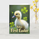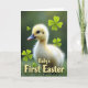 This card features a fluffy golden-yellow baby waterfowl in a tall, vertical layout, its head slightly tilted as it looks gently to the left with a tender, friendly gaze 🐇. The downy feathers are shown with soft texture, and the small bill has a faint pinkish‑gray tint that adds a sweet contrast. Behind the bird, the background fades into a smooth blur of fresh green foliage, giving the scene an early‑spring setting. A few stylized four‑leaf, clover‑like shapes drift around the bird like little floating charms, adding a light, affectionate touch 🌷. Near the bottom, the phrase “Baby’s First Easter” is placed prominently in warm yellow lettering, standing out against the green backdrop. The lighting is diffused and gentle, creating a glow along the bird’s rounded cheek and chest that feels like a quiet cuddle captured on paper. Several small clover emblems appear scattered across the green background, with the brightest ones hovering near the bird’s shoulder and above the text.