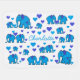 Surrounded by hearts and set onto white ground, the hand-painted aqua-blue elephants with their purple-blue ears have sweet smiles on their faces as they interact with one another. Some elephants balance hearts of love on their trunks.