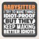 Funny Babysitter Sayings "Babysitter I Try To Make Things Idiot Proof But They Keep Making Better Idiots". Grab this Funny Babysitter design as a funny gifts for an awesome mom, dad or friend.