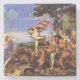 Bacchus and Ariadne by Titian, 1522-1523, depicts the woman Ariadne from Greek mythology, abandoned on the island of Naxos. The god Bacchus leaps towards her from his chariot driven by a pair of cheetahs before a procession of satyrs, nymphs and revelers. The interplay between warm tones of flesh and vegetation against cool blue sea and clouds exemplifies Titian’s renown as a colorist.