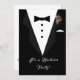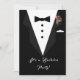 Design features the look of a tuxedo on front, invitation text on back. Letters are in a clear black font against a white background. Remember, weddings aren't just for the bride!