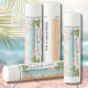 Tropical Beach Watercolor Bachelorette Party Favor Lip Balm. A cool watercolor beach theme with shades of pink and teal, setting the vibe for a beach escape with the bride and her besties. From trips to Florida, California, or even something more international like Mexico, Hawaii or The Bahamas, this girls weekend is going to rock! Cute pink and white beach chair, umbrella, and a girl lounging in the sun. Palm trees swaying, shells to collect—it's all about those chill tropical beach vibes. With modern fonts adding a stylish twist, it's the perfect look for your bachelorette weekend. Just you and your crew, making memories against a backdrop of sand and sea. Check out all of the coordinating pieces too!