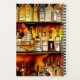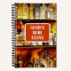 Fun notebook to keep track of all your favorite cocktail recipes features an artistic depiction of liquor and spirits bottles arranged on shelves for the back bar of an establishment. Digital watercolor created using AI generating software. Customizable center text frame