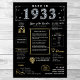 Embark on a journey back to 1933 with our captivating digital poster, brimming with historical facts, news highlights, and intriguing tidbits from bygone years. Enhanced with faux gold and silver accents set against a striking black backdrop, adorned with distinctive icons and bold typography, this poster radiates timeless elegance. Whether igniting conversations at birthday parties or anniversaries, or when tastefully framed, it evolves into a cherished keepsake, suffusing any space with a nostalgic allure.