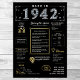 Step back into 1942 with our captivating digital poster, packed with historical tidbits, noteworthy events, and intriguing stories from yesteryear. Featuring elegant gold and silver touches set against a bold black background, adorned with unique symbols and stylish text, this poster exudes classic charm. Whether it's sparking conversations at gatherings or simply displayed as a cherished keepsake, it brings a nostalgic vibe to any space.