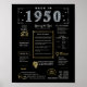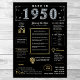 Step into 1950 with our engaging digital birthday poster, filled with historical facts, important events, and interesting stories from the past. Decorated with classy gold and silver details on a bold black background, featuring unique symbols and stylish text, this birthday poster has a timeless charm. Whether sparking conversations at birthday gatherings or kept as a keepsake, it brings back nostalgic memories.