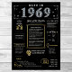 Step back into 1969 with our captivating digital birthday poster, brimming with historical facts, noteworthy events, and intriguing stories from the past. Adorned with elegant gold and silver details against a bold black background, featuring unique symbols and stylish text, this birthday poster exudes timeless charm. Whether sparking conversations at birthday gatherings or cherished as a keepsake, it evokes nostalgic memories.