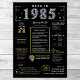 Step back into 1985 with our captivating digital birthday poster, brimming with historical facts, significant events, and enthralling narratives from the past. Embellished with elegant gold and silver accents set against a striking black backdrop, this poster exudes timeless allure. Whether displayed proudly at birthday gatherings or held dear as a keepsake, it promises to ignite lively discussions and evoke cherished memories.