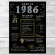Step back into 1986 with our captivating digital birthday poster, brimming with historical facts, significant events, and enthralling narratives from the past. Embellished with elegant gold and silver accents set against a striking black backdrop, this poster exudes timeless allure. Whether displayed proudly at birthday gatherings or held dear as a keepsake, it promises to ignite lively discussions and evoke cherished memories.