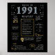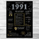 Step into 1991 with our captivating digital birthday poster, overflowing with historical facts, significant events, and mesmerizing narratives from the past. Adorned with elegant gold and silver accents against a striking black backdrop, this birthday poster emanates timeless charm.