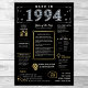 Step back into 1994 with our captivating digital birthday poster, brimming with historical facts, significant events, and enchanting narratives from the past. Adorned with elegant gold and silver accents against a striking black backdrop, this birthday poster exudes timeless charm.
