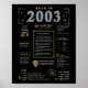 Take a journey back to 2003 with our captivating digital birthday poster, teeming with historical facts, significant events, and captivating narratives from the past. Adorned with elegant gold and silver accents against a striking black backdrop, this birthday poster radiates timeless charm.