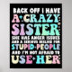 Funny Sisters quote design: Back Off I Have A Crazy Sister She Has Anger Issues And A Serious Dislike For Stupid People And I Am Not Afraid To Use Her. Awesome tee with groovy saying, can make a great present for middle, youngest and oldest sister, best family matching outfit for crazy sisters. Perfect sarcastic apparel for stepsister, sister-in-law, friend, coworker, daughter, niece... in birthday, mother's day, father's day, valentine's day...