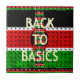 The design features the flag's colors—black, red, and green—in a brick-like, textured pattern, giving the piece a tactile, handmade feel. The iconic Maasai shield and spears are centered over the flag, while the bold, simple yellow text "BACK TO BASICS" emphasizes the importance of culture, unity, and national foundation. The entire motif is framed by a decorative border of miniature Kenyan flags, completing this proud, patriotic look.