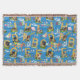 Capital letters A B C D E F G H I J...house pets and school tools against a blue sky repeat pattern