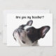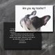 Boston Terrier back to school, welcome message cards from teacher. A cute Boston Terrier on the front is looking upward. Sample wording is "Are you my teacher?". Add your personal message to the students on the back using white, printed text over black. Choose the printed, or downloadable option.