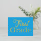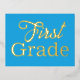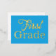 Welcome to first grade, postcard from the teacher. Customize the text for any grade, which is printed in foil lettering. Large wording covers the pretty blue card in gold, silver, or rose gold foil announces the upcoming year of school. On the back, the teacher can create a custom message to send to his / her students in blue, printed font. Include classroom information, day and time school begins, or anything the child and parents may appreciate.