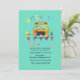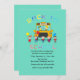 A cute back to school invitation featuring children on a school bus and others holding balloons.