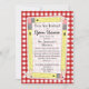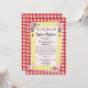 An invitation featuring a red gingham background on front and back. Front features yellow pencils arranged in a rectangle shape with sheer white center. Personalize with teacher's name, grade, location, and date of your back to school open house orientation.