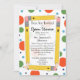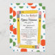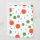 An invitation featuring a green, orange, and blue polka dot background on front and back. Front features yellow pencils arranged in a rectangle shape with sheer white center. Personalize with teacher's name, grade, location, and date of your back to school open house orientation.