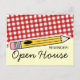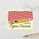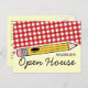 A postcard featuring a design on front consisting of red gingham and a yellow pencil. Text reads "REMINDER: Open House." Personalize the back with details of your event.