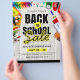 Back To School Sale Retail Marketing Advertisement Flyer Featuring Yellow Glowing Typography, School Supplies Border Frame & Grey Wooden Background. Customize To Your Liking.