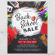 Back to school retail flyer features a chalkboard background, chalk streaks and colorful school supplies.