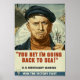 This is a image of a Vintage World War Propaganda poster that shows a Old Salty Sea Dog carring his bag and saying "You Bet I'm Going Back To Sea".