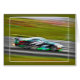 A streaking race car spouts fire as it reaches the end of the straight.