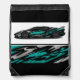 This drawstring backpack is shown with a auto race car print.