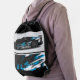 This drawstring backpack is shown with a auto race car print.
