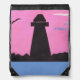 This backpack is designed with a silhouetted lighthouse against a pink sunset sky next to a silver sea.