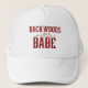 Fun women's trucker hat for those livin' the country life. "Backwoods Babe" distressed dark red text with fancy flourish