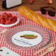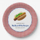 Add this personalized paper plate to your next backyard cookout. The design offers a large graphic of a hot dog and is accented with a red checked border. Custom text allows you to add your name and date.