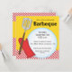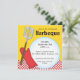 This brightly colored barbeque invitation features a gold background with a stripe of red checks across the bottom. A red oven mitt and a spatula graphic are on the left side with a big white circle opening for the text. This invite can be customize for any type of a barbeque or cookout.