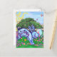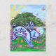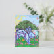 Backyard Easter Egg Hunt Postcard featuring our fun and colorful artwork of a Native American style blue bunny rabbit hopping among hidden decorated Easter Eggs in a grassy yard with a scattering of flowers, a brick wall, and a sunny springtime sky is a great way to send out your holiday greetings for Easter. This playful springtime was digitally painted by our talented children's book illustrator, Traci Van Wagoner, and is perfect for anyone who loves bunnies, rabbits, Easter eggs, decorative eggs, Easter, spring, and colorful artwork. Spring has sprung. Have a happy Easter!