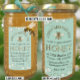Honeycomb and vintage watercolor bee, with a seafoam green background color. "HONEY" is written in chiseled metallic gold text. Your name or apiary name is printed in curved text above the honeybee.