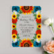 Elegant and colorful floral design for a backyard summer event. Features teal blue roses, white daisies, red wildflowers and sunflowers