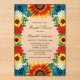 Elegant and colorful floral design for a backyard summer event. Features teal blue roses, white daisies, red wildflowers and sunflowers
