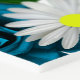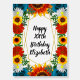 Elegant and colorful floral design for a backyard summer event. Features teal blue roses, white daisies, red wildflowers and sunflowers with gold geometric frame