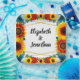 Elegant and colorful floral design for a backyard summer event. Features teal blue roses, white daisies, red wildflowers and sunflowers with gold geometric frame