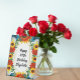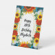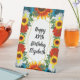 Elegant and colorful floral design for a backyard summer event. Features teal blue roses, white daisies, red wildflowers and sunflowers with gold geometric frame
