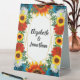 Elegant and colorful floral design for a backyard summer event. Features teal blue roses, white daisies, red wildflowers and sunflowers with gold geometric frame
