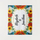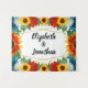 Elegant and colorful floral design for a backyard summer event. Features teal blue roses, white daisies, red wildflowers and sunflowers with gold geometric frame