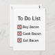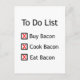 A bacon "to do" list with the three primary goals, Buy Bacon, Cook Bacon and Eat Bacon.