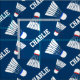 Badminton racquet sport repeat personalized shuttlecock pattern sporting design fabric. White shuttles with a blue or red band on a blue background color which can be changed if required. Ideal for badminton fans. Customize with your own choice of name, currently reads Charlie. Art and designed by Sarah Trett.