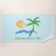 Cute Bahama beach girl towel for fun and sun in the sand, featuring a painted palm tree, sun, and ocean wave. Be ready for a beach party this summer! Blue green and yellow gold.