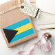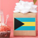 The flag of the Bahamas is aquamarine blue, yellow and black in colour, with a black triangle at the left, and three blue and yellow horizontal stripes. It has a 1:2 ratio, and was first used in 1973.